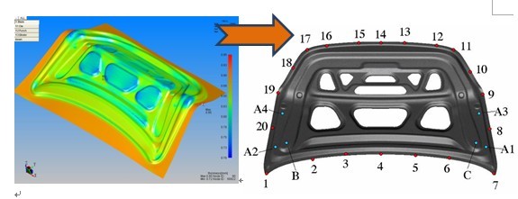 該汽車行李箱蓋內(nèi)板通過拉深-修邊工序完成沖壓成型后,在外輪廓上選擇若干個點,對比仿真結果與實驗測試結果的回彈量。