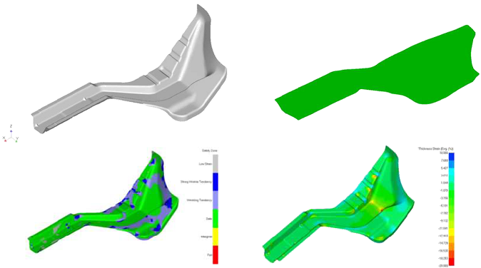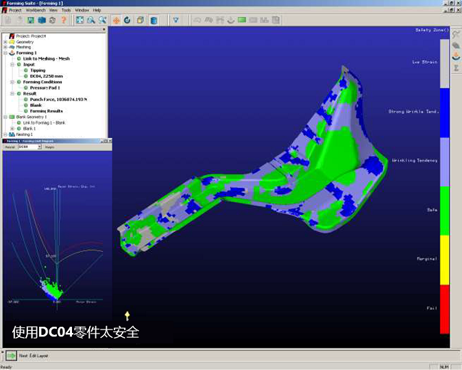 由圖可知,使用材料牌號DC04時,成型分析結(jié)果顯示零件的可成型性安全裕度很大,零件太安全,可以把材料牌號的等級從DC04降低到DC01