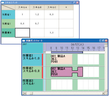 在豎軸為資源,橫軸為技能的種類的矩陣畫面輸入技能值??筛鶕?jù)此值計算工作時間。如果此資源如果沒有設(shè)置技能值、則視為不可用資源。