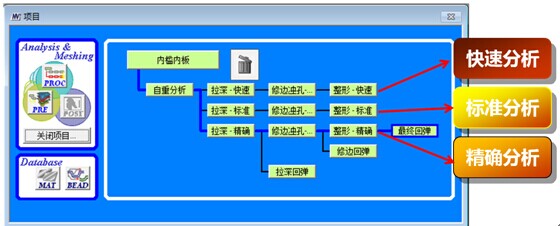 仿真項目模板的訂制是根據(jù)企業(yè)實際產(chǎn)品生產(chǎn)工藝和仿真需求而訂制的通用模板,由于企業(yè)的主要產(chǎn)品類型和制造工藝都相對比較固定,在進行仿真分析時,其工藝流程、模具動作以及材料相關(guān)參數(shù)的設定具有通用性,此時,可以根據(jù)不同零件的成形工藝特點以及對于仿真計算的特定要求,制定不同的仿真項目模板,這樣可以降低有限元仿真的技術(shù)門檻,優(yōu)化仿真參數(shù)設置(保證計算速度和精度),提高仿真工作效率,并實現(xiàn)沖壓仿真過程標準化、流程化。
